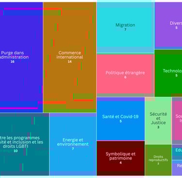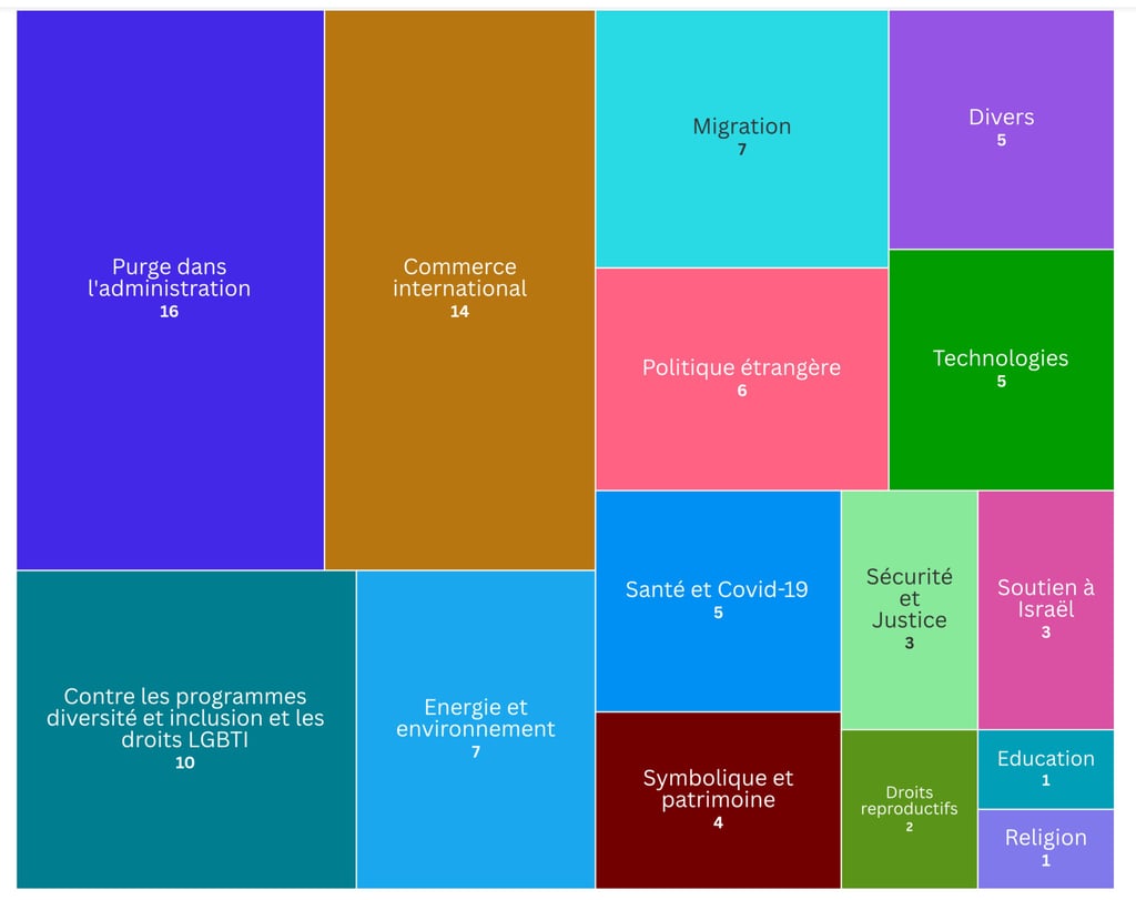 Le document ci-dessus illustre les domaines au sujet desquels D Trump a signé des décrets présidentiels (Exécutive Orders) . Du 20/1/2025 au 10/03/2025 ce ne sont pas moins de 89 textes qui ont été signés battant tous les records (Biden 37 ; Obama 17 ; Trump I 16) . Le Président a également révoqué près de 70 décrets de l'administration Biden sur les 162 textes signés par Joe Biden en 4 ans.